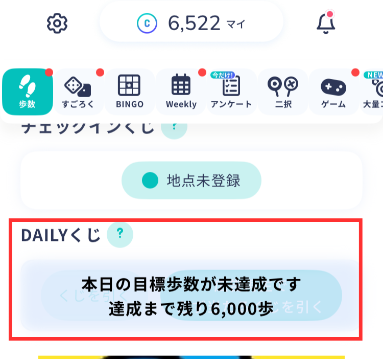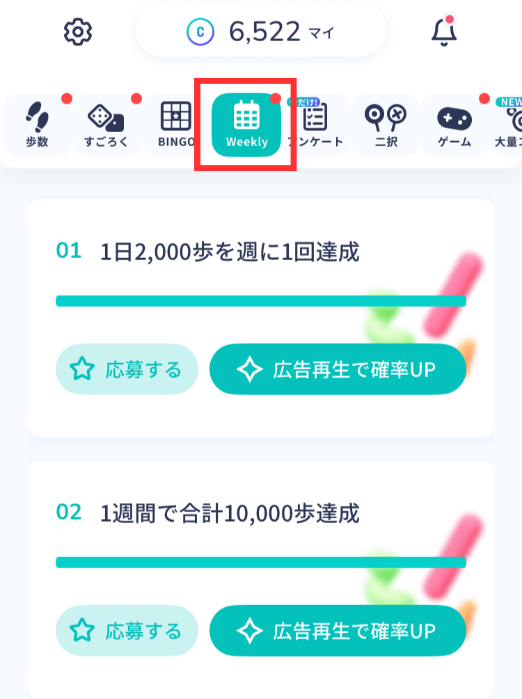 1週間ごとに更新されるミッション(1日2000歩など)をクリアするとコインが当たります。